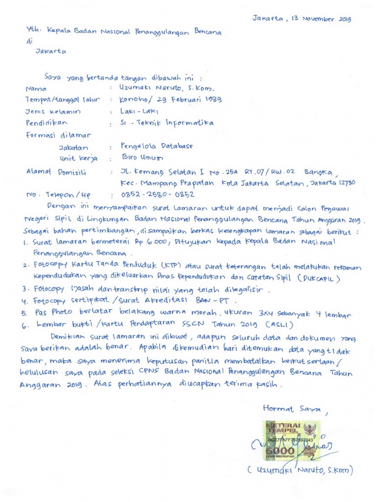 6000 berikut ini contoh surat lamaran cpns untuk masing masing instansi yang dilamar. Adapun contoh surat lamaran cpns bnpt 2018 dan contoh surat pernyataan cpns bnpt 2018. Surat pernyataan cpns bnpt : Guna mendaftar cpns di badan nasional penanggulangan. Pada tahun ini badan nasional penanggulangan terorisme membuka peluang bagi anda putra putri.